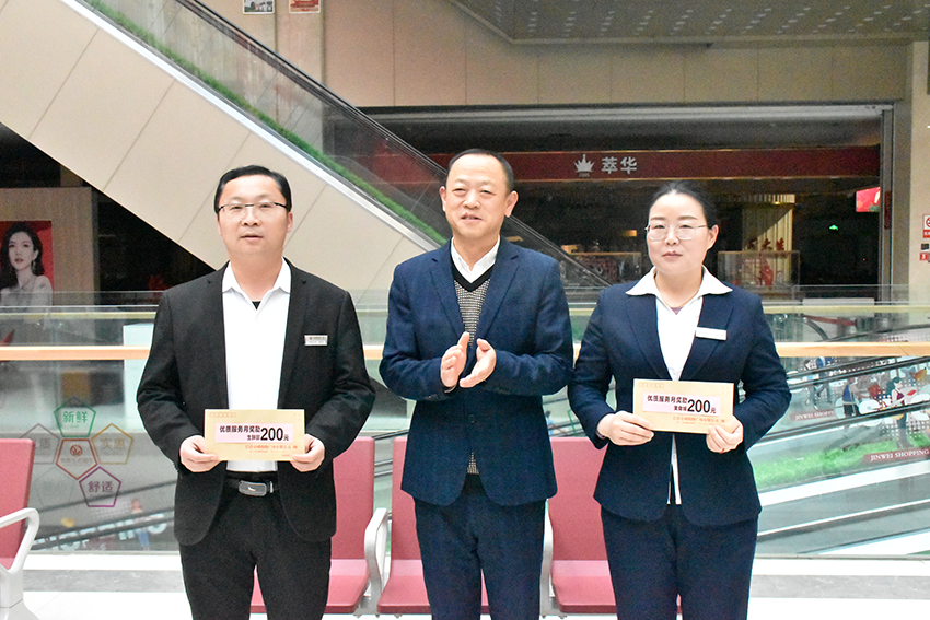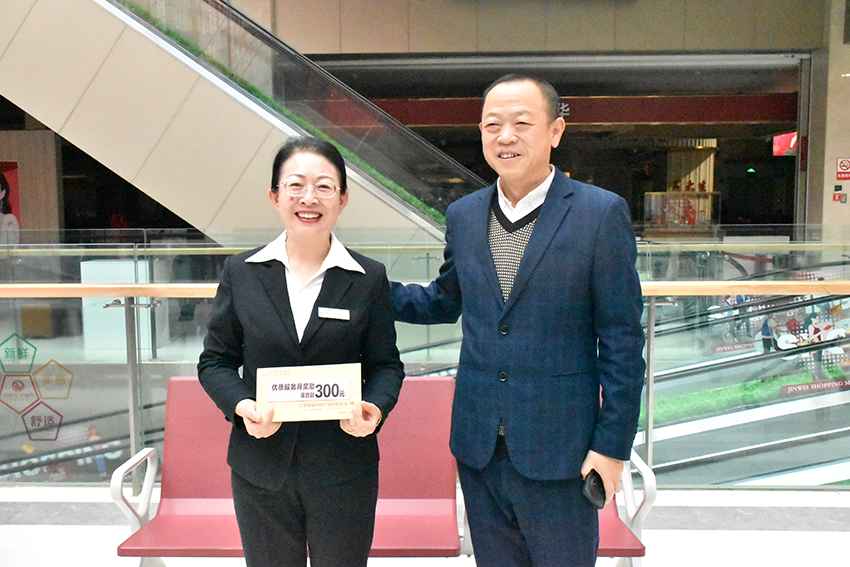 金威購物廣場(chǎng)總經(jīng)理韓映紅為員工發(fā)放優(yōu)質(zhì)服務(wù)月獎勵