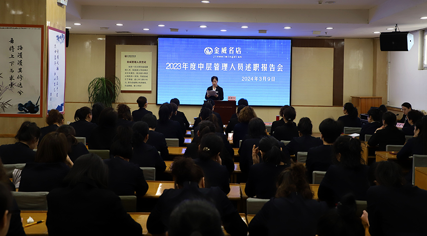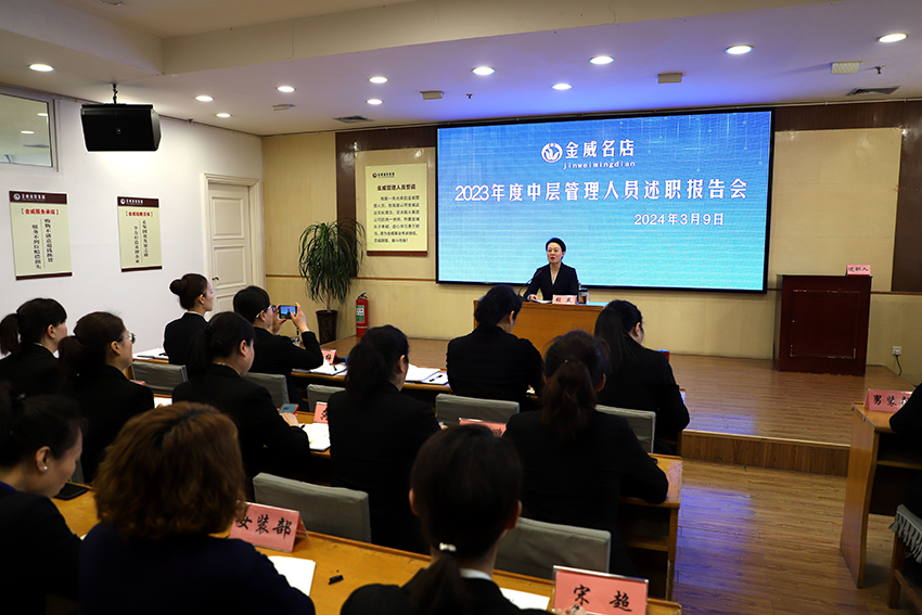 3月9日上午,名店召開(kāi)了“2023年度中層管理人員述職報告會(huì )”。9名未參加集團公司集中述職的管理人員依次登臺做了工作匯報。名店服務(wù)品牌、星級員工、店長(cháng)、“金青班”第一、二期學(xué)員以及部門(mén)助理以上管理人員共計90人參會(huì )聆聽(tīng)。名店總經(jīng)理張燕、總經(jīng)理助理劉成梅全程參會(huì )。會(huì )后,張總做了總結講話(huà),并現場(chǎng)組織管理人員進(jìn)行了電子述職評議工作。